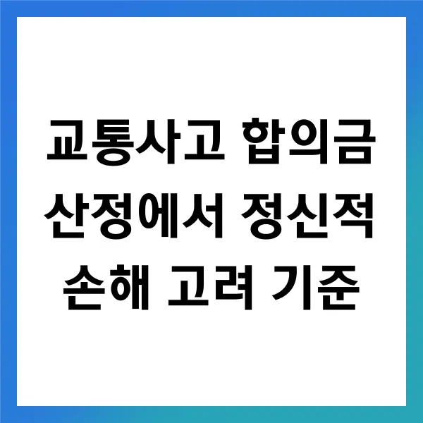 정신적 손해는 합의금 산정에 있어 매우 중요한 요소 입니다. 많은 경우, 사고에 대한 신체적 상처가 회복되더라도 정신적 고통은 장기적으로 지속되는 경우가 있습니다. 연구에 따르면, 사고 피해자의 50% 이상이 정신적 고통을 호소하며, 이는 치료와 회복에 상당한 비용을 발생시킬 수 있습니다. 이에 따라 합의금 산정 과정에서 정신적 손해를 적절히 반영하는 것이 필수적 입니다.