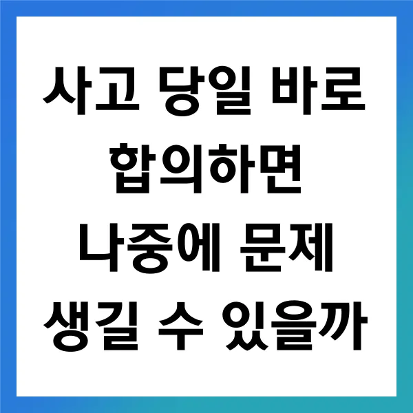 사고 당일 바로 합의를 결정 하는 것은 향후 복잡한 법적 문제를 야기할 수 있습니다. 따라서 사고 직후 변호사 상담은 필수적 입니다. 전문가의 조언 없이 합의서를 작성하는 것은 상당한 리스크 를 동반합니다. 변호사는 법률의 전문가로서, 사고와 관련된 모든 법적 이슈를 파악하고 분석 할 수 있습니다. 그들의 통찰력과 경험은 매우 귀중합니다.