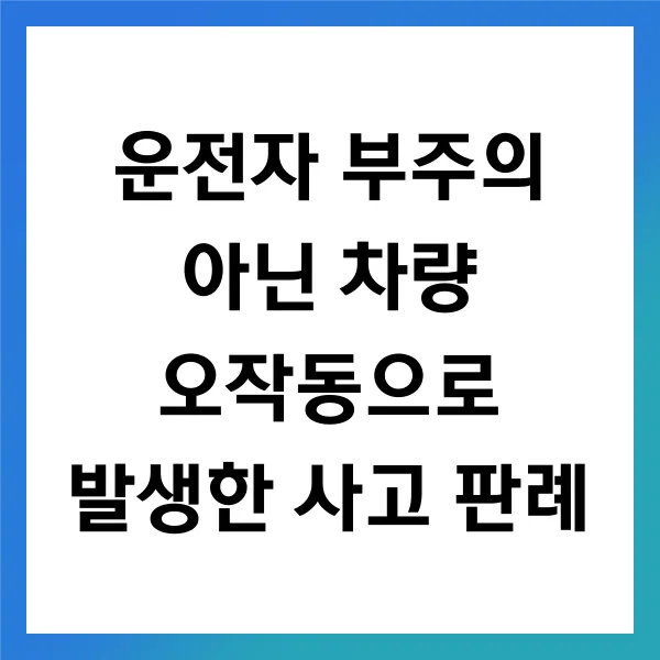 운전자 부주의가 아닌 차량 오작동으로 발생한 사고에 대한 법적 논의는 매우 중요합니다. 특히, 판례를 통해 차량 오작동의 정의와 법원의 판단 기준을 명확히 이해하는 것 이 필요합니다. 이를 통해 운전자가 자신의 책임을 명확히 인식하고, 필요한 예방 조치를 강구할 수 있습니다. 따라서, 사고를 방지하려는 노력은 단순히 운전자의 몫이 아니며 , 제조사와 관련 기관의 책임도 함께 강조되어야 합니다. 이러한 법적 접근이 우리 모두의 안전한 도로를 만드는 데 일조할 것입니다.