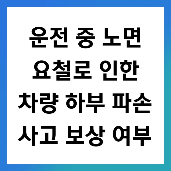 결론적으로, 운전 중 노면 요철로 인한 차량 하부 파손 사고는 특정 조건에서 보상이 가능하지만, 각 보험사의 약관과 보상 조건을 철저히 이해하고, 증거 자료를 충분히 준비하는 것이 필수적 입니다. 차량 운전자는 이러한 사항들을 고려하여 좀 더 안전하게 도로를 주행할 수 있도록 대비해야 합니다.